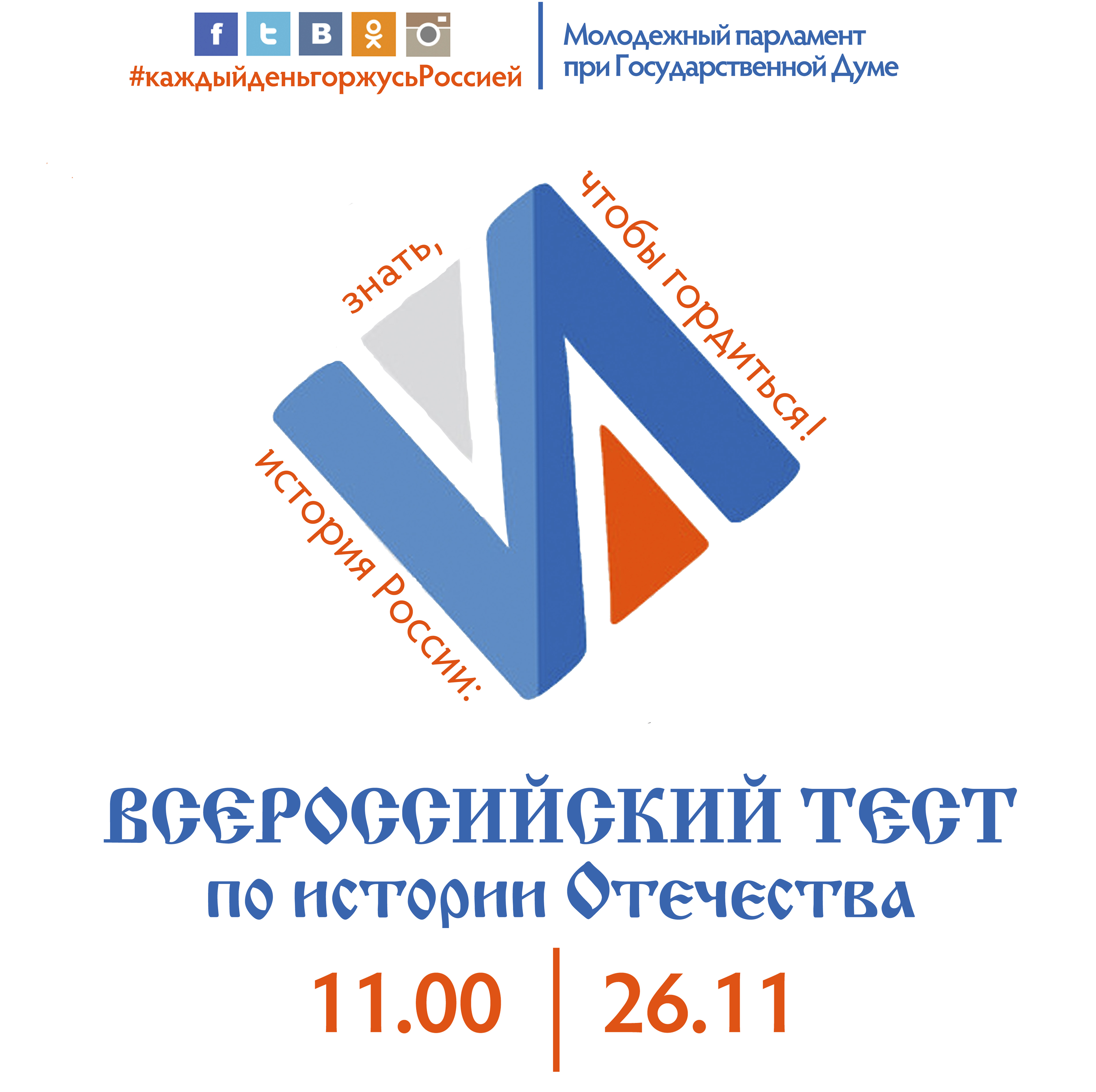 Историческое тестирование пройдет уже в третий раз и будет посвящено всей отечественной истории. В апреле в рамках проекта Молодежного парламента при Государственной Думе «Каждый день горжусь Россией!» состоялся Тест по истории Великой Отечественной войны. Всего участниками предыдущих двух стали более 320 тысяч человек из 33 стран. В этом году соорганизатором тестирования выступит Российское военно-историческое общество.