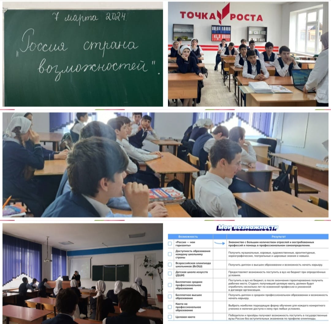 07.03.20247 марта 2024г. в МБОУ «СОШ № 4 с.Самашки » для обучающихся 6-10 классов прошло занятие профориентационного курса «Россия - мои горизонты» на тему: «Россия-страна возможностей». В ходе занятий школьники узнали о том, что за последние годы наше государство создало множество новых образовательных и карьерных возможностей для школьников, студентов и молодых специалистов.