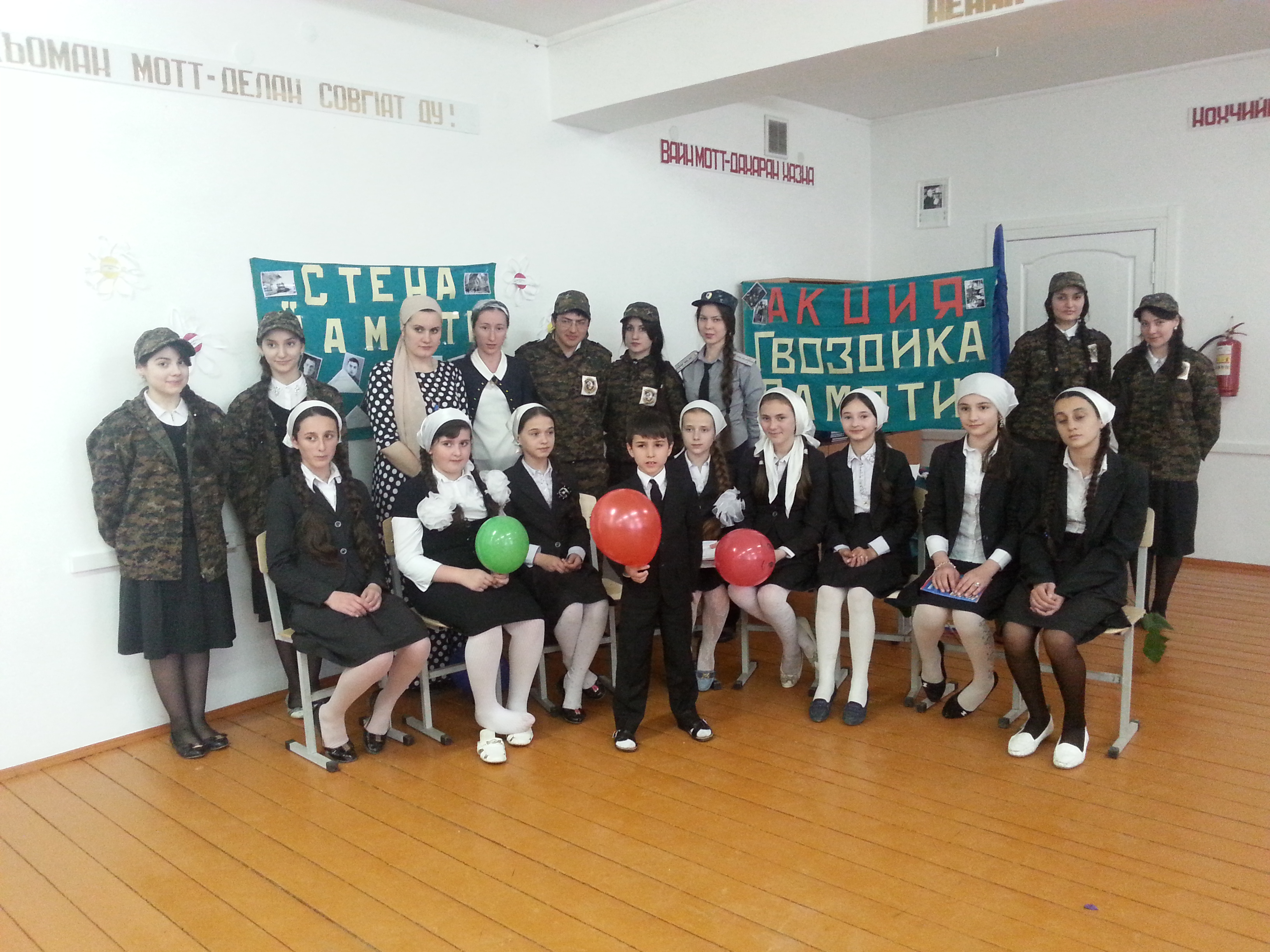 Организаторы акции Цагуева Х.А и Майсулова Д.М. провели общешкольное мероприятие, на котором учащемся было рассказано о письмах-треугольниках. Было взято полотно, на котором написали « Стена памяти». Далее на этот полотно были прикреплены письма-треугольники и фотографии ветеранов ВОВ.