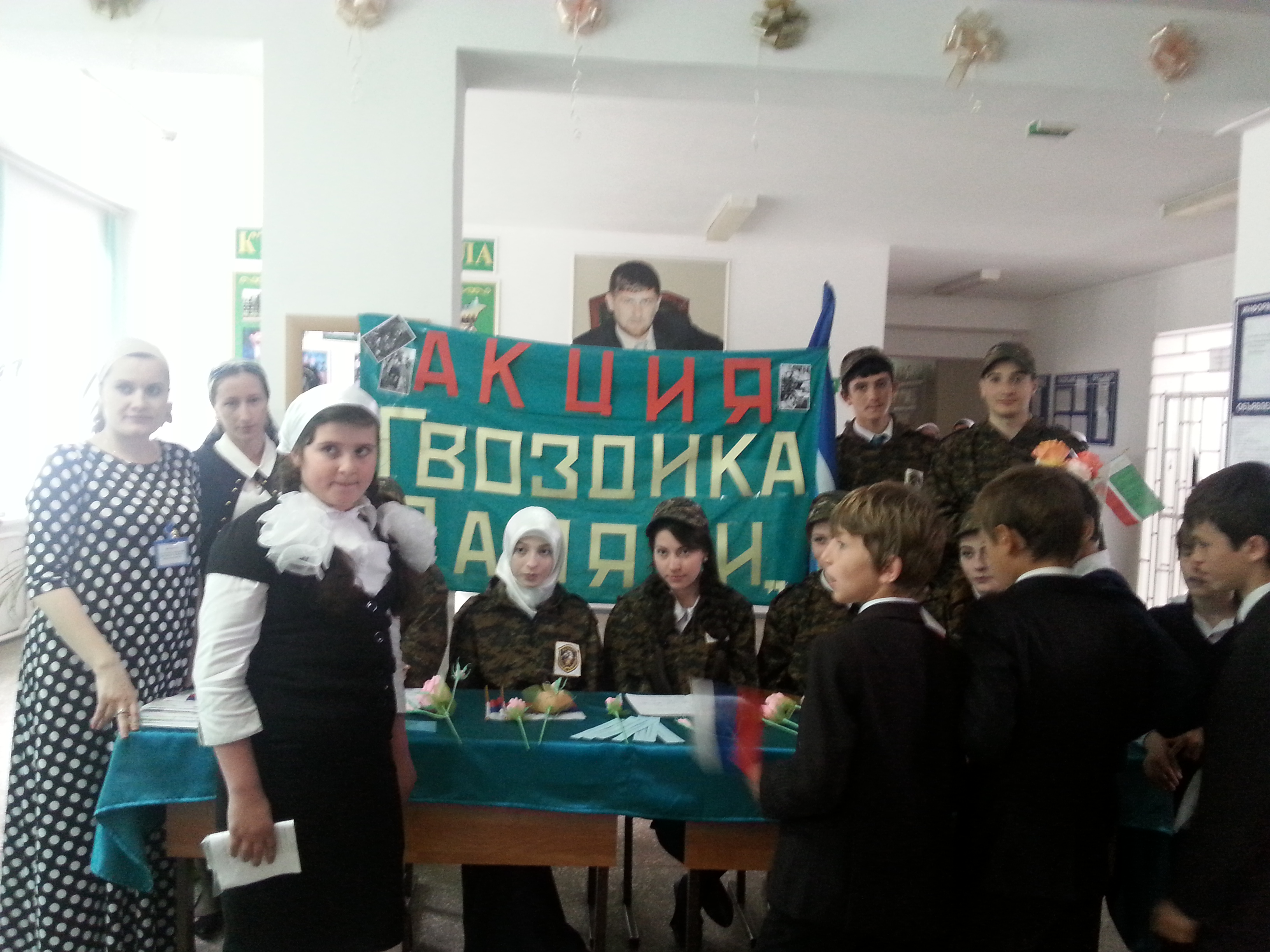 Где были собраны гвоздики, которые 9 мая будут возложены к памятнику героям ВОВ. Учащиеся школы, учителя приняли активное участие в акции. Каждый участник брал листок с надписью «я участвую в акции» и клал гвоздику в вазу. Организаторы акции Цагуева Х.А и Майсулова Д.М.